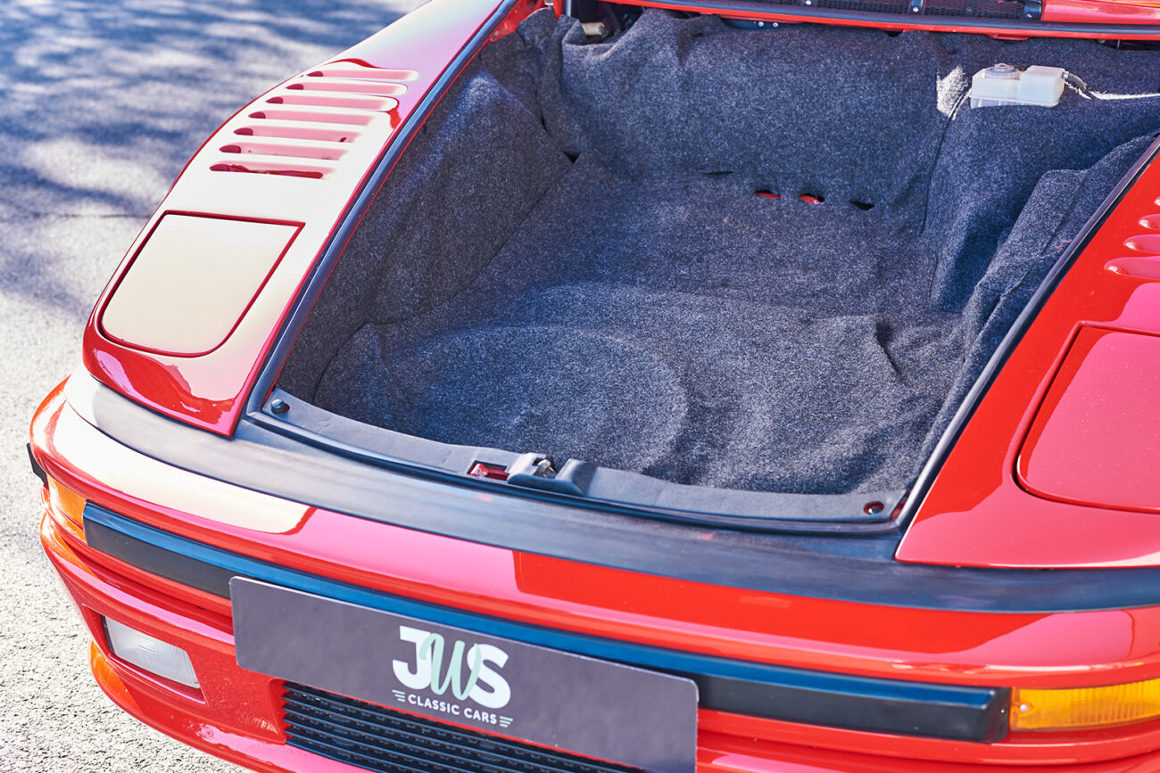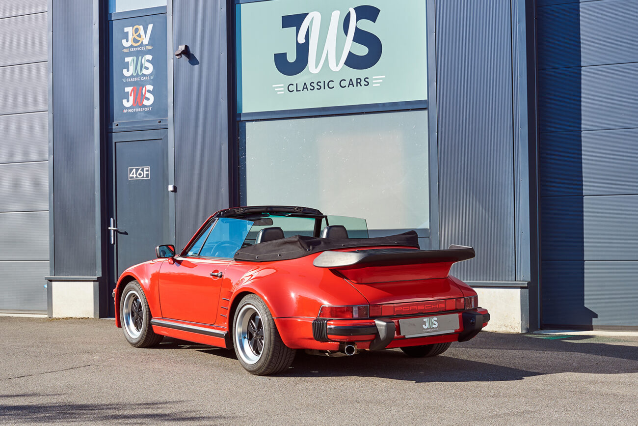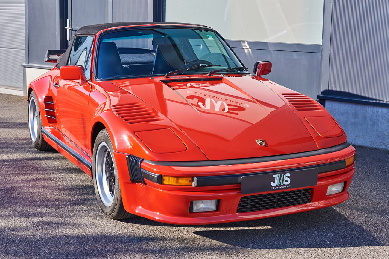Origineel verliet deze prachtige Porsche 911 cabrio de fabriek als een standaard Porsche 911 Carrera cabrio. Kortelings na de originele levering in Amerika werd het voertuig professioneel omgebouwd naar een “Slantnose” uitvoering, zoals de legendarische Kremer Porsche 935 turbo racewagens. Deze professionele ombouw is amper te onderscheiden van een originele fabrieksversie en is tot op heden nog steeds een zeer opvallende verschijning. Het prachtige rode lakwerk, de zwarte “Fuchs” velgen en andere zwarte accenten maken de ultieme 80’s look van dit voertuig compleet. Zowel het koetswerk, het interieur en het onderstel zijn in perfecte staat. De 3.2 liter carrera motor, originele sport ophanging, de G50 gangwissel en sport-uitlaat maken van deze “Slantnose” de perfecte rijderswagen. Kortom, een uniek voertuig dat absoluut zijn plaats verdient in elke collectie.